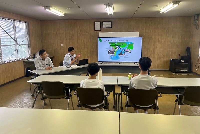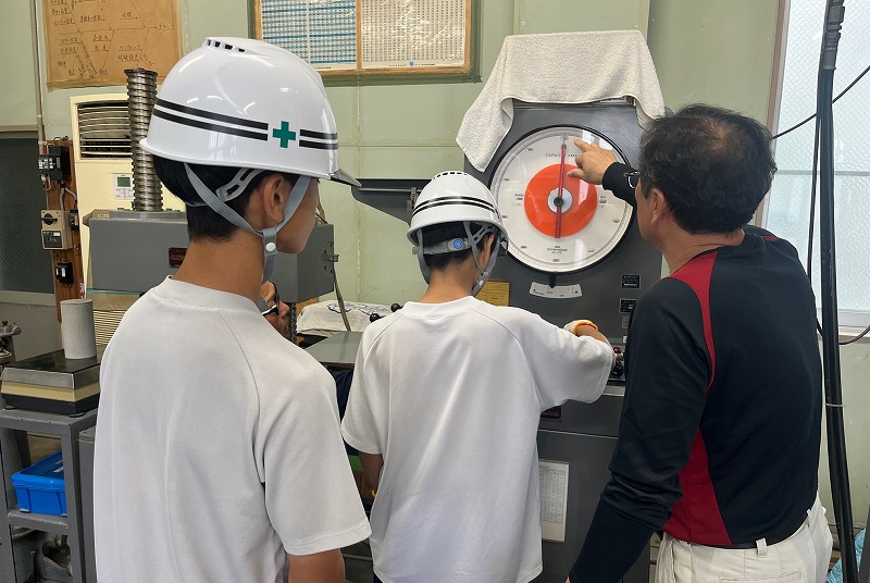 プレキャストコンクリート製品についての説明後、圧縮試験などの実務体験が行われました。
